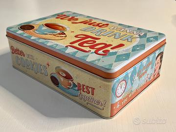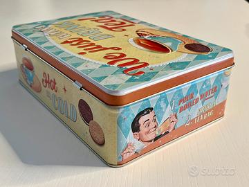 Vendo 3 scatole in latta con coperchio a cerniera, da 2,5 litri, design vintage, a €6 ciascuna. Le dimensioni sono cm 23 x 16 x 7. Vendo per errore di acquisto, quindi sono intatte e mai state utilizzate.