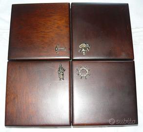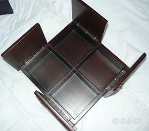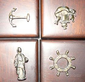 Scatola in legno di mogano a quattro scomparti chiusi da portelli incernierati in modo da oscillare in direzioni contrapposte e sfalsate di 90° l'uno rispetto a quello adiacente. Le dimensioni della scatola sono cm 22,50 x 22,50 x altezza cm. 5. I bordi a vista dei portelli sporgono meno di 1 cm dal corpo della scatola per consentire la presa e la movimentazione di ciascun portello. Sulla superficie di ciascun portello è fissato un oggetto in bronzo raffigurante di volta in volta : un navigatore (Cristoforo Colombo ?) , un veliero (caravella ?) , la ruota di un timone antico e un'ancora. La scatola è stata usata poco ed è in ottimo stato di conservazione. Peso complessivo 600 gr.