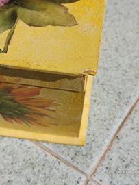 Vendo scatola artigianale in legno con disegni floreali a decoupage, dimensioni altezza 13 cm, larghezza 17 cm e lunghezza 24 cm. Dotata di cerniera di chiusura. Decorata sia all'esterno che all'interno. Buone condizioni generali, una lieve ammaccatura su uno spigolo (vedi foto).