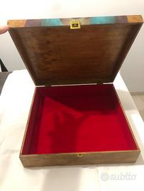 Bellissima scatola in legno decorata con volto di donna, Interno rivestito in raso rosso, con immagine donna, porta tutto/ portagioielli cm 35x36,5x10.