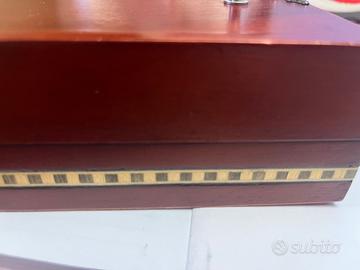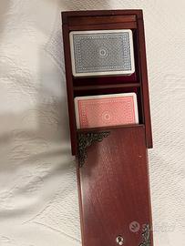 scatola in legno pregiato con fregi in argento e sul fondo tessere di legno in altri colori. la scatola contiene carte da gioco e tessere di domino ancora imballate nella loro plastica. é molto particolare perché ha due fondi e quindi si apre sia spostando il coperchio di lato (dove c'è il primo cassetto con le carte) sia girando i cassetto delle carte che porta al 2 cassetto con le tessere di domino