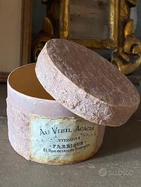 Scatola in legno in patina antica color rosa antico con vecchia etichetta.