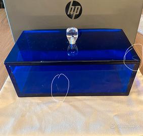 Scatola in Plexiglass Blu Marino Trasparente con Pomello in Plexiglass bianco trasparente, presenta una scheggiatura poco visibile ed un graffietto. Dimensioni : L 25cm x A 10cm x P 14cm