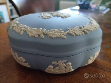 Scatola rotonda smerlata in porcellana inglese jasperware con decorazione a rilievo di soggetti mitologici.