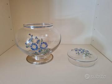 Scatola in vetro trasparente con coperchio e base argentata. Decoro fiori azzurri. Fine anni '60 inizi '70. Ritiro gratuito a Imola