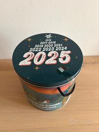 Scatola in latta da collezione degli Alpini, edizione 2025 "10 anni di bontà". Molto versatile: ideale per biscotti, decorazioni natalizie o piccoli giocattoli. Condizioni perfette, pari al nuovo. Dimensioni: Altezza 20 cm, Diametro 19 cm.