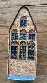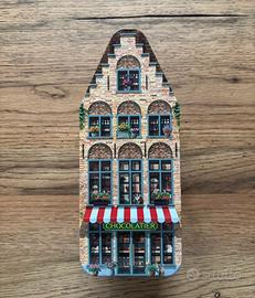 Scatola di latta a forma di cassetta. Dimensioni 15x6x6 cm