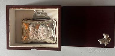Bellissima scatolina in legno (cm 8x10x4h) con applicazione di un fiocco in argento. Al suo interno piccola targhetta (cm 4x6)con rilievo in argento raffigurante due angioletti(cherubini).