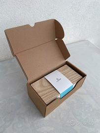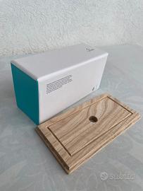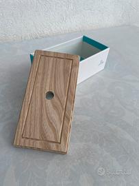 Scatola in cartone colore bianco e turchese con coperchio in legno con foro circolare al centro; mai usata come nuova.