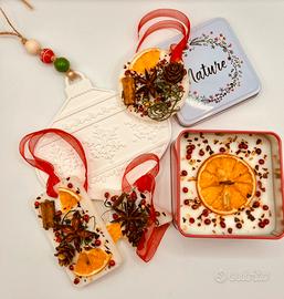 - 1 decorazione natalizia in polvere di ceramica con perline in legno. Le creazioni in cera di soia sono profumate con fragranza di cannella e arancia.