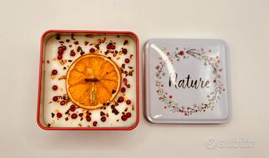 - 1 candela in cera di soia naturale in contenitore di latta decorata con botaniche,