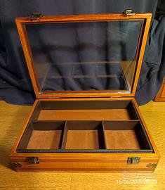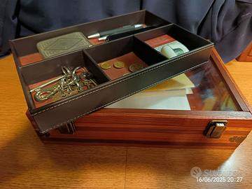 Scatola organizer per scrivania interamente fatta a mano in legno di frassino e inserti in noce nazionale, fondo capiente per materiale cartaceo, chiusure e serrature in pregiato ottone. Pezzo unico e irripetibile.