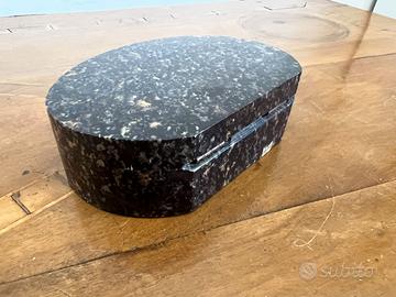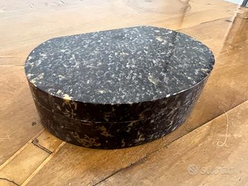 Elegante formato ovale ricavato da un'unica lastra di pietra naturale di colore marrone-grigio-nero con caratteristiche inclusioni cristalline bianche e dorate. Probabilmente granito blu pearl o larvikite norvegese, pietra nota per i suoi feldspati iridescenti.