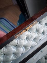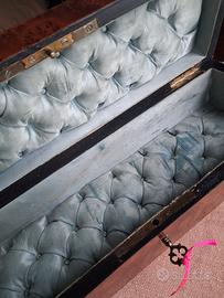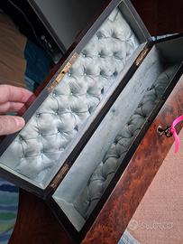 II coperchio è decorato con un intarsio in lamina di ottone centrale ovale che aggiunge un ulteriore elemento di raffinatezza al pezzo , con impresse due lettere "M" e " C" probabilmente il nome del proprietario o della famiglia di appartenenza.