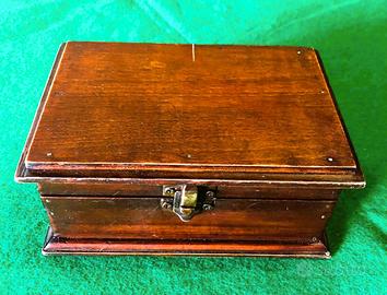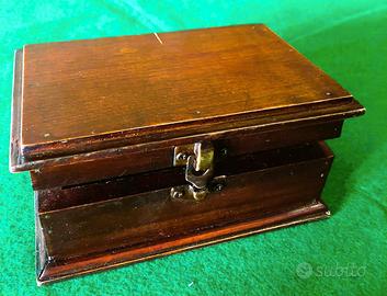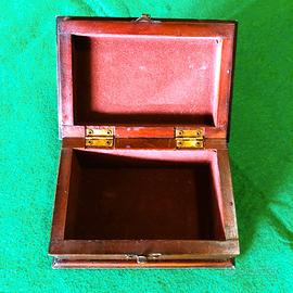 Scatola portagioie, cofanetto in legno vintage, realizzato in legno con finitura scura e accessori in metallo color ottone. Forma rettangolare che ricorda un piccolo baule, con bordi rinforzati. L'interno è rivestito in un morbido tessuto vellutato di colore bordeaux per proteggere il contenuto. Utilizzato in genere per conservare gioielli, orologi o altri piccoli oggetti di valore. Mostra segni di usura e patina di un oggetto vintage o antico. Dimensioni 16,5 cm. X 11 cm. h. 7 cm.