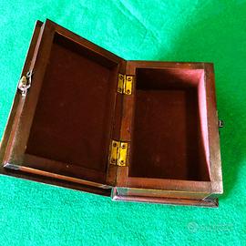 Scatola portagioie, cofanetto in legno vintage, realizzato in legno con finitura scura e accessori in metallo color ottone. Forma rettangolare che ricorda un piccolo baule, con bordi rinforzati. L'interno è rivestito in un morbido tessuto vellutato di colore bordeaux per proteggere il contenuto. Utilizzato in genere per conservare gioielli, orologi o altri piccoli oggetti di valore. Mostra segni di usura e patina di un oggetto vintage o antico. Dimensioni 16,5 cm. X 11 cm. h. 7 cm.
