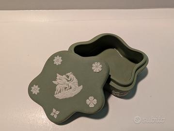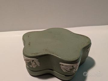 Piccola scatola (cm 10x8) a forma di stella in fine gres non smaltato sviluppato dall'azienda inglese Wedgwood a partire dal XVIII secolo. Realizzata nel tipico colore verde salvia e caratterizzata da bassorilievi bianchi che raffigurano scene mitologiche, cherubini e motivi floreali.