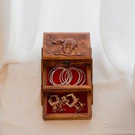 Scatola portagioie artigianale in legno a strati con incisione decorativa raffigurante un elefante. La struttura a più livelli e scomparti consente di organizzare anelli, orecchini, collane, bracciali e altri piccoli gioielli. Adatta sia come organizer funzionale sia come elemento di arredo decorativo.