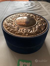 Scatola portagioie in velluto blu con coperchio in lamina d’argento sbalzato. Diametro 14 cm, altezza 7 cm