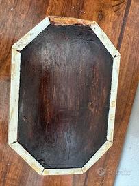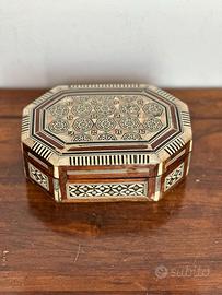 scatola portagioie o portaoggetti vintage, caratterizzata da una forma ottagonale e realizzata con la tecnica dell'intarsio (marquetry).