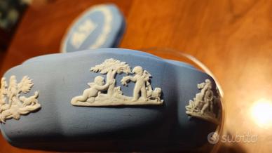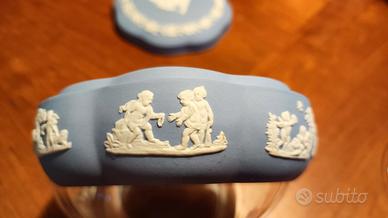 Scatola portagioie/portacaramelle in finissima ceramica Wedgwood circolare, decorata con bassorilievo bianco (relief neoclassical cameo, pale blue jasper) e blu. Dotata di coperchio. Origine: Inghilterra. Periodo: 1980.
