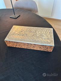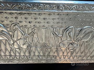 Scatola portagioie / portaoggetti in radica con coperchio decorato – vintage Prezzo trattabile Elegante scatola in radica di legno con interno laccato nero lucido, ideale come portagioie, porta orologi o oggetto d’arredo. 🔸 Caratteristiche principali: •Struttura esterna in radica con bellissima venatura naturale •Coperchio in metallo lavorato a rilievo con scena decorativa (stile cavalleresco / medievale) •Interno laccato nero con divisori (perfetto per organizzare gioielli o piccoli oggetti) •Chiusura stabile e struttura solida 📏 Dimensioni: •Lunghezza: circa 35 cm •Larghezza: circa 18 cm •Altezza: circa 7–8 cm 📌 Condizioni: •Ottime condizioni generali •Lievi segni del tempo sul coperchio (visibili in foto), che ne aumentano il fascino vintage 💡 Ideale per: •Portagioie / orologi •Oggetto da collezione •Arredo elegante per casa o studio •Idea regalo originale 📍 Consegna a mano o spedizione disponibile