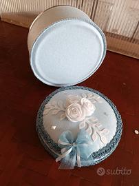 Sul coperchio (imbottito) sono posizionate 3 rose bianche realizzate a mano. La scatola é arricchita da una bella passamaneria, da un fiocco doppio in organza e da un fiocco triplo con nastrino di raso.