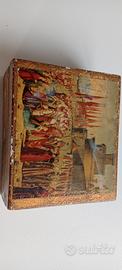 Scatola portaoggetti in legno dorato, immagine riprodotta "Incontro dei pellegrini con papa Ciriaco" di Vittore Carpaccio (1492). 13,5x11,5x5,5cm .