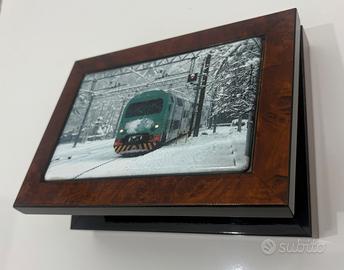 Scatola portaoggetti in legno massello con finitura scura venata, elegante e ben rifinita. Il coperchio è decorato con un’immagine fotografica raffigurante un treno in transito durante una nevicata, incorniciata e protetta, che dona all’oggetto un carattere suggestivo e dal gusto ferroviario/nostalgico.