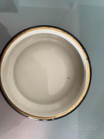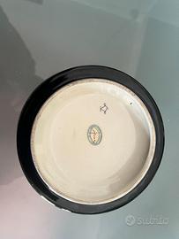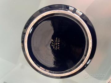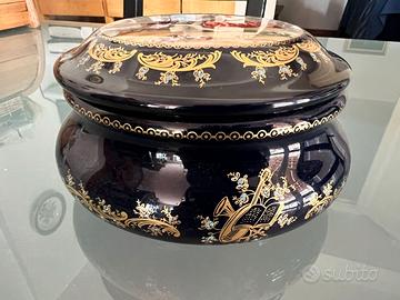 Elegante scatola decorativa in porcellana/ceramica smaltata, caratterizzata da un raffinato fondo blucobalto con ricche decorazioni dorate e motivi floreali. Il coperchio presenta una scena romantica in stile classico, finemente dettagliata. Oggetto ideale come elemento d’arredo, portagioie o pezzo da collezione, perfetto per ambienti classici o vintage. Caratteristiche: Colore: blu scuro (cobalto) con finiture oro Decorazioni: motivi floreali e strumenti musicali Coperchio con scena figurativa romantica Stile: vintage / classico Condizioni: Buone condizioni generali, senza rotture evidenti. Lievi segni del tempo compatibili con l’età (vedi foto). Dimensioni (stimate): Diametro: circa 20–25 cm Altezza: circa 12–15 cm Spedizione: Spedizione accurata con imballo protettivo. Note: Perfetta come idea regalo o per collezionisti di oggetti decorativi in stile antico.