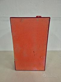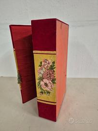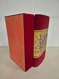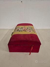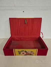 Scatola portaoggetti Scatola rivestita in tessuto rosso con motivi floreali. In discrete condizioni, davanti è un pò deformata (vedi chiusura non allineata) e ha i ganci che la tengono aperta staccati. Esternamente non ha buchi o rotture, ha solo qualche segni di utilizzo e usura negli spigoli. Per altre foto contattatemi Misure Larghezza 51 cm Profondità 32 cm Altezza 16 cm