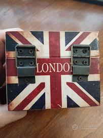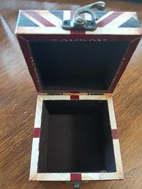Scatola portaoggetti "London"legno rivestita con bandiera inglese NUOVO 10cmx10cmx8cm
