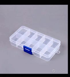 scatola portaoggetti con scomparti, trasparente in ottimo materiale. vari utilizzi, con blocco per non farla aprire e gancio per moschettone.