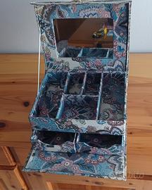 Scatola portatutto vintage a forma di bauletto completamente foderata in tessuto (anche sul fondo esterno), due cassettini, cinque scomparti, uno specchio. Misura in centimetri 21,5 x 27 x 21.