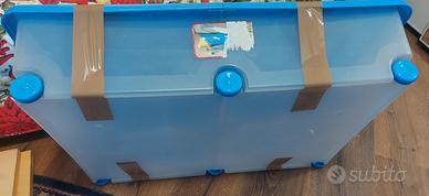 Scatola in plastica con coperchio amovibile e rotelle per traino. Dimensioni: 77x58x18 h