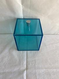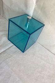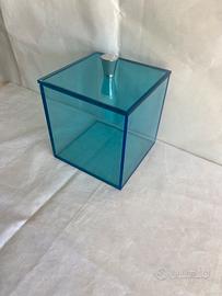 Scatola Quadra in Plexiglass Blu Trasparente il coperchio è dotato di 3 Pomelli Cromati Lucidi. Presenta una lieve scheggiatura interna poco visibile. Dimensioni : cm 13x13x13