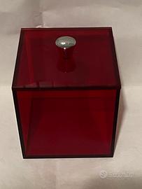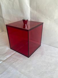 Scatola Quadra in Plexiglass Rosso Trasparente il coperchio è dotato di 3 Pomelli Cromati Lucidi. Dimensioni : cm 13x13x13