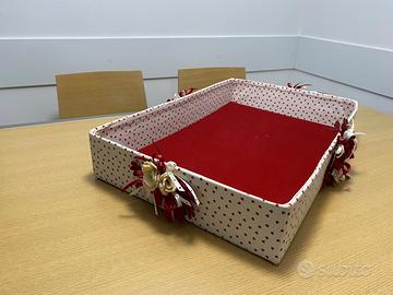 Scatola cm 62x41, altezza 10. Completamente rivestita in tessuto e con decorazioni su tutti i lati. Usata una sola volta per consegna bomboniere ad una cerimonia.