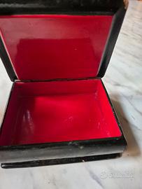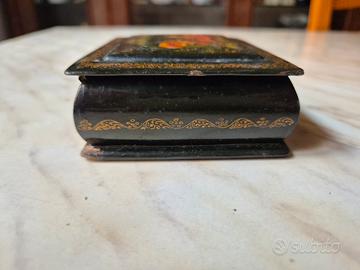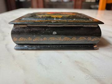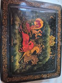Raffinata scatola in lacca russa originale proveniente dal celebre villaggio d'arte di Palekh L'opera è un esempio classico della maestria russa nella pittura di miniature, Soggetto: Una dinamica "Troika" (slitta tradizionale trainata da tre cavalli) che sfreccia in un paesaggia invernale stilizzato, arricchita da dettaali celesti (luna e stelle) e un'abitazione rurale (Isba) sulla sfondo. Tecnica: Dipinta interamente a mano utilizzando la tecnica della tempera all'uovo e rifiniture minuziose in foglia d'oro zecchino. La qualità del tratto sui cavalli e sulle vesti dei passeggeri è tipica della scuola di Palekh. derivata dall'antica tradizione delle icone. Firma e Oriaine: La scatola presenta iscrizioni in oro in cirillico alla base del coperchio: A sinistra: "Manex" (Palekh) - Luogo di origine. Al centro: "Tpoňka" (Troika) - Titolo dell'opera,. A destra: "PoroB" (Rogov) - Firma dell'artista. Materiale: Papier-mấché (cartapesta pressata laccato nero all'esterno con interno nel classica rosso lacca vibrante Dimensioni: 8 x 10 x 3 cm Condizioni: Oggetto vintage in buone condizioni generali. L'opera pittorica sul coperchio è molto ben conservata. Sono presenti lievi segni di usura e piccole mancanze di lacca sugli spiqoli e sui bordi (come visibile nelle foto), che testimonianc l'autenticità e l'età dell'oggetto.