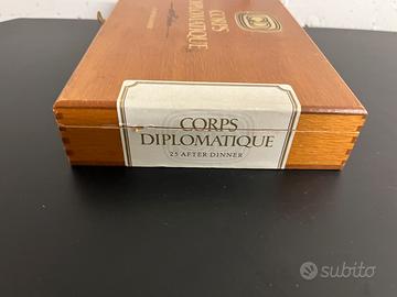 Scatola per sigari vintage di Corps Diplomatique, un marchio noto per la produzione di sigari di alta qualità. La scatola può contenere fino a 25 sigari.
