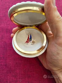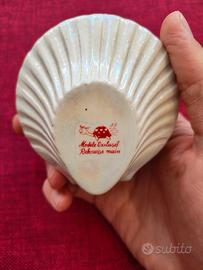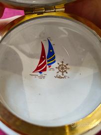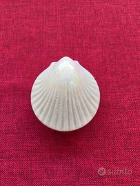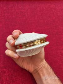 Scatolina in porcellana del 1985 finemente decorata, realizzata a mano e parte di una collezione esclusiva. Il design richiama uno stile nautico, con un disegno di barche a vela all'interno e dettagli in metallo dorato. Il guscio esterno è modellato a forma di conchiglia con una finitura lucida perlata. Sul fondo è presente la firma che certifica l'autenticità artigianale "Modèle Exclusif Rehaussé Main". Questo piccolo contenitore dell'85 è ideale come scatola porta-gioie o come elegante elemento decorativo per ambienti con tema marino. L'oggetto è in ottime condizioni.