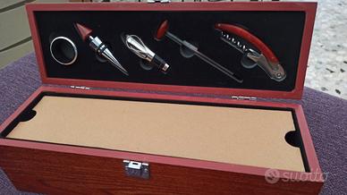 Elegante scatola regalo in legno completa di accessori per il servizio, la degustazione e la conservazione del vino.
