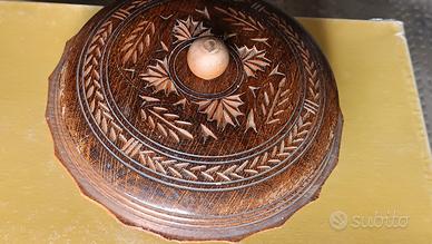 Elegante scatola in legno lavorata artigianalmente con coperchio intagliato a motivo floreale. Pezzo decorativo dal fascino rustico e tradizionale.