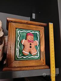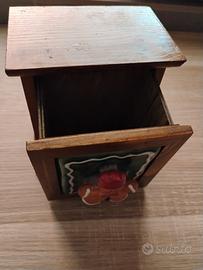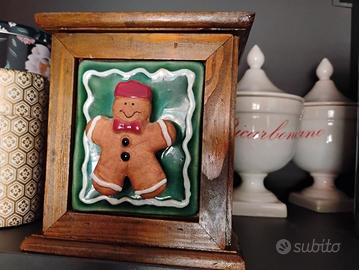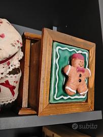 Piccolo mobiletto a cassetto in legno, solido e ben costruito, con dettagli curati e una presenza calda, da oggetto vissuto. Il frontale è decorato con una placca in ceramica smaltata effetto craquelé, con soggetto "omino pan di zenzero" in rilievo modellato a mano, le leggere imperfezioni garantiscono la lavorazione artigianale autentica. NO Poste italiane 🚫 fuori altezza Il cassetto è dotato di fermo interno in legno, un accorgimento pratico che ne impedisce la fuoriuscita completa e conferma la qualità della realizzazione. Nata come confezione artigianale per dolci (Italia, 2011), oggi trova una seconda vita perfetta in una cucina dallo spirito “dispensa della nonna”. Ideale per custodire spezie particolari, bustine di tè o piccoli biscotti fatti in casa. Si inserisce con naturalezza in ambienti cottage core, campagna inglese o french country, portando con sé un senso di semplicità, cura e tradizione. L’etichetta originale sul fondo è ancora presente e contribuisce a raccontarne la storia, non è un articolo industriale. DIMENSIONI Alto 15,5 cm Largo 14 Profondo 10 + sporgenza omino 11,5 cm Peso 570 g Omino 7 cm x 5,5 cm Ottime condizioni generali, con normali leggeri segni del tempo che ne valorizzano il carattere. Spedizione accurata e veloce