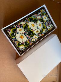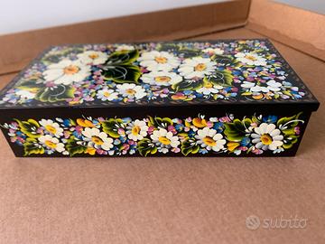 Portagioie in legno dipinto con motivo di fiori, con interno in velluto. Fatto a mano e dipinto a mano con una tecnica antica chiamata Petrykivka, laccata e poi firmata.