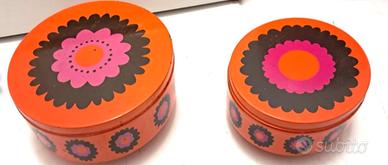 Scatole di latta vintage in metallo con motivo floreale arancione e viola, probabilmente prodotte da Brabantia o Laurids Lønborg