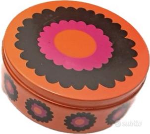 Queste scatole di latta decorative furono prodotte negli anni '70, un periodo caratterizzato da design audaci e colori vivaci ispirati al movimento psichedelico e al design scandinavo. I motivi floreali geometrici in arancione, nero e viola erano estremamente popolari nell'arredamento domestico dell'epoca, riflettendo l'estetica ottimista e giocosa del decennio. Produttori come Brabantia nei Paesi Bassi e Laurids Lønborg in Danimarca creavano contenitori funzionali che erano anche oggetti decorativi.