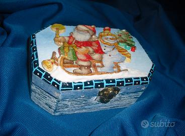 -Scatola portagioie dipinta con effetto craclè e decorata con la tecnica del découpage 3D, con Babbo Natale e pupazzo di neve, misura 16 x 11 x 5,5, singolarmente euro 20 ;
