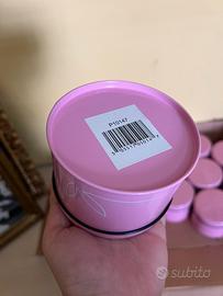 Scatola in latta rosa con logo Playboy inciso sul coperchio e stampato all’interno.