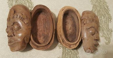 Vendo coppia di scatole porta oggetti in legno duro, originarie Bali (Indonesia), scavate interamente a mano in singoli blocchi di legno.